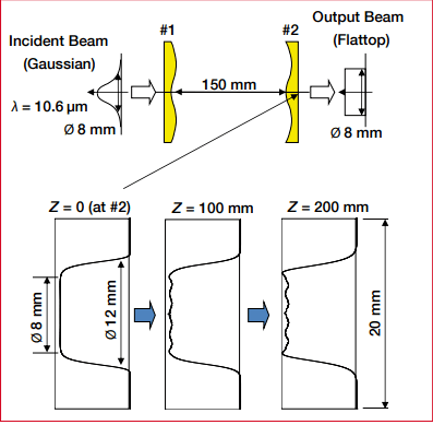 為了減少光束傳輸過(guò)程中平頂輪廓的退化,平頂光束的波前誤差應(yīng)通過(guò)光束整形器的第二個(gè)元件進(jìn)行校正。圖4顯示了輸出“準(zhǔn)直”(平波前)平頂光束的兩元件型光束整形器的示例。在該圖中,第一個(gè)非球面元件(#1)在焦點(diǎn)位置將CO2激光器的高斯光束轉(zhuǎn)換為平頂光束。放置在焦點(diǎn)位置的第二個(gè)元件(#2)通過(guò)平展波前(校正像差)來(lái)準(zhǔn)直平頂光束。因此,如圖4所示,準(zhǔn)直平頂光束可以以較小的強(qiáng)度變化傳播很長(zhǎng)的距離。