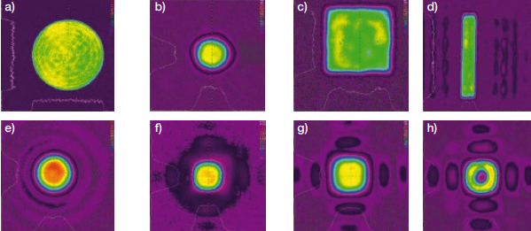 圖7從a) - d)幾何光束映射整形器或e) - h)長(zhǎng)焦深光束整形器輸出光束的測(cè)量強(qiáng)度分布圖示例。
