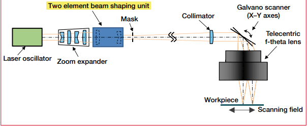在利用先進(jìn)的高功率激光器加工工業(yè)材料的過(guò)程中,光束整形光學(xué)技術(shù)是一項(xiàng)關(guān)鍵技術(shù)。非球面或衍射光束整形器將單模(TEM00)激光束的高斯光強(qiáng)分布轉(zhuǎn)換為平頂光束。雖然非球面光束整形器可以制作圓形平頂,但衍射光束整形器可以在輸出光束形狀上實(shí)現(xiàn)很大的靈活性。光束整形通常與掃描光學(xué)系統(tǒng)相結(jié)合,掃描光學(xué)系統(tǒng)由振鏡和f-θ透鏡組成。這些光束整形器用于脈沖或連續(xù)單模激光應(yīng)用,即薄膜或塊體材料的燒蝕、切割、鉆孔、劃線、退火等。本文介紹了實(shí)際應(yīng)用中使用的光學(xué)系統(tǒng)的原理、設(shè)計(jì)概念和規(guī)格示例。