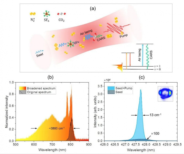 圖1. 空氣激光輔助的相干拉曼散射技術(shù)的基本原理:(a)空氣激光和相干拉曼散射的產(chǎn)生機(jī)制示意圖;(b)展寬后的泵浦光光譜與原始光譜的對比;(c)空氣激光的頻譜和空間分布。