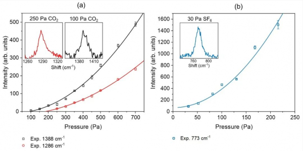 圖2. 實驗測得的相干拉曼信號強(qiáng)度與氣體濃度的定量關(guān)系。插圖為最小濃度下測量的CO2和SF6的拉曼信號,CO2(1388 cm-1拉曼峰)和SF6的最小探測濃度分別為0.1%和0.03%。
