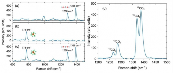 圖3. 利用空氣激光輔助的相干拉曼光譜技術(shù)測得的(a)空氣中濃度為0.5%的CO2,(b)濃度為0.1%的SF6,(c)濃度為0.5%的CO2與濃度為0.1%的SF6混合物的拉曼信號;(d)空氣中濃度均為0.4%的12CO213CO2的拉曼信號。