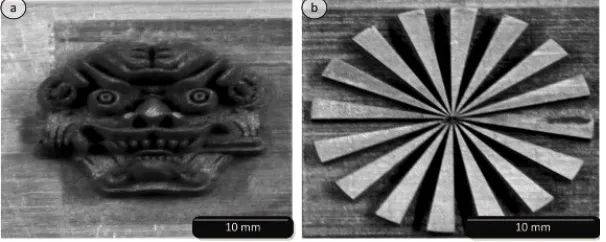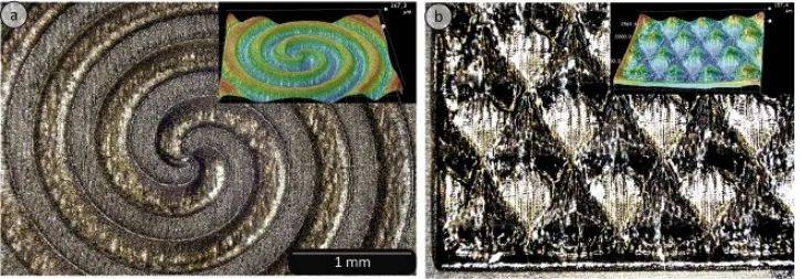 應(yīng)用多邊形掃描儀的深度映射模式,還可以選擇高功率連續(xù)激光作為2.5D高速雕刻的光源。通常情況下,連續(xù)波輻射會(huì)產(chǎn)生較大的熔池,但快速的掃描速度和由此產(chǎn)生的短交互時(shí)間允許在沒(méi)有熔融微觀結(jié)構(gòu)的情況下雕刻金屬(圖5a)。