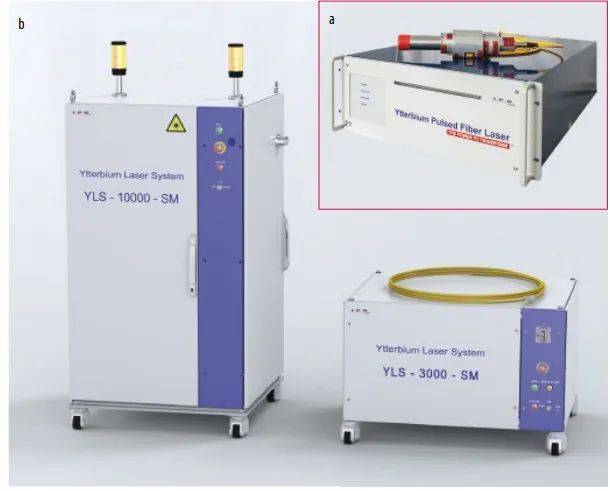 圖2新型高重復(fù)率鐿納秒脈沖光纖激光器機(jī)架系列,用于超快掃描速度(a);YLS單模大功率光纖激光器系列,3kW和10kW單模(b)。