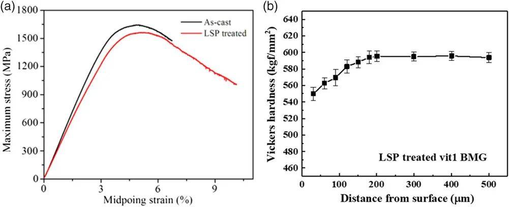 圖33 a)鑄態(tài)和經(jīng)LSP處理的Vit1 BMG的三點(diǎn)彎曲法向應(yīng)力和中點(diǎn)應(yīng)變曲線(xiàn);b)經(jīng)LSP處理的Vit1 BMG截面上的顯微硬度值。