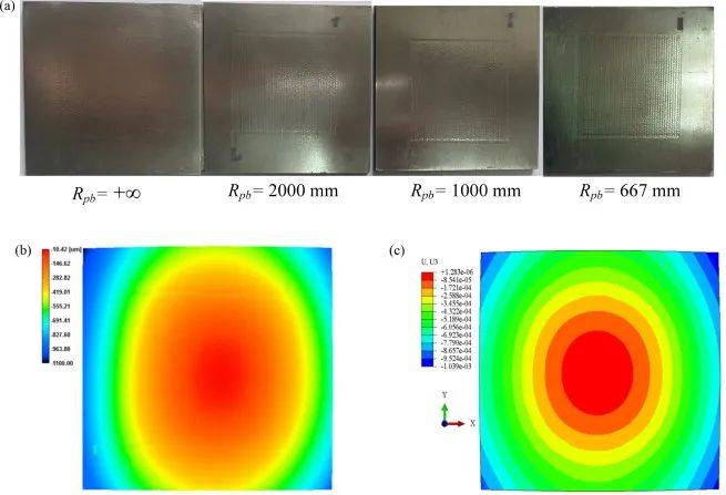 通過(guò)實(shí)驗(yàn)和基于本征應(yīng)變的模型,可以得到不同預(yù)應(yīng)力條件下LPF后試樣的變形形狀。上圖顯示了在667 mm預(yù)彎曲半徑下樣品的變形形狀輪廓。可以觀察到,方形板被制成凸出平面的形狀。數(shù)值模型預(yù)測(cè)的形狀與實(shí)驗(yàn)結(jié)果非常相似。
