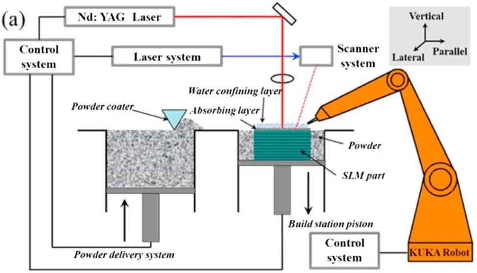 然而,由于激光沖擊波的影響深度有限,LSP的積極影響僅存在于上表面層,無(wú)法消除樣品內(nèi)部累積的殘余拉伸應(yīng)力。因此,提出了3D LSP(3D LSP)的概念,這是一種將SLM與LSP集成在一起的新型混合AM工藝。也就是說(shuō),在SLM過(guò)程中,在沉積幾層金屬粉末后引入LSP處理,并且SLM繼續(xù)在LSP處理層上進(jìn)行。之后,再次引入LSP來(lái)處理新沉積的層。這個(gè)循環(huán)一直持續(xù)到沉積完成。集成SLM-LSP系統(tǒng)的示意圖如圖27所示。通過(guò)將LSP集成到SLM工藝中,樣品內(nèi)部有害的拉伸殘余應(yīng)力可以轉(zhuǎn)化為壓縮殘余應(yīng)力,部件的疲勞性能可以進(jìn)一步提高。