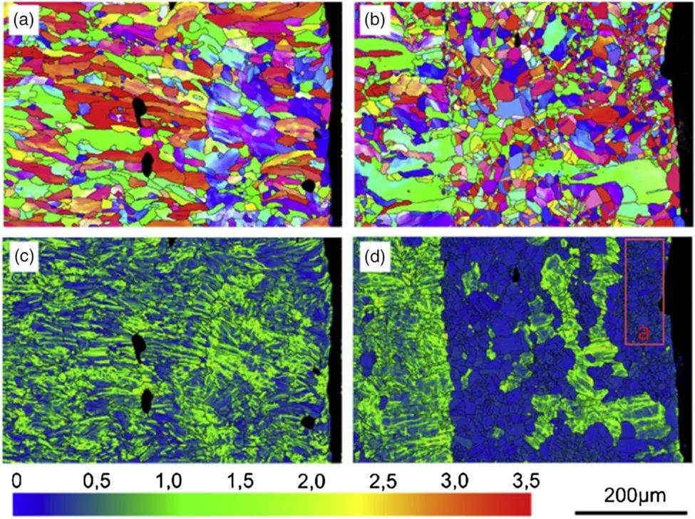 圖29 SLM AB和SLM LSP樣品在1100℃熱處理10 min后的EBSD圖:a) SLM AB樣品的反極圖,b) SLM LSP樣品的EBSD圖。c) SLM AB樣本的局部錯(cuò)位圖和d) SLM LSP樣本。