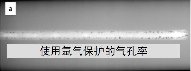 圖2.使用不同保護(hù)氣體焊接2.0mm不銹鋼:a)使用氬氣的焊縫X射線結(jié)果顯示,熱影響區(qū)附近產(chǎn)生多個(gè)氣孔;b)使用氮?dú)獾暮缚pX射線結(jié)果顯示,焊縫無氣孔。
