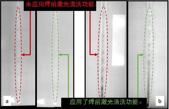 圖4.激光清洗后焊縫質(zhì)量提高:a)鋁5052:X射線結(jié)果顯示,在焊接前應(yīng)用激光清洗后,氣孔減少;b)鍍鋅板:X射線結(jié)果顯示,在焊接前應(yīng)用激光清洗后,缺陷顯著減少。