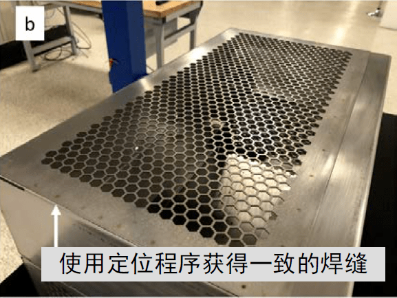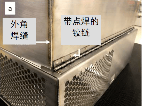 圖1.不銹鋼激光焊接:a)具有高質(zhì)量的外角焊縫和點(diǎn)焊鉸鏈;b)使用預(yù)設(shè)點(diǎn)焊參數(shù)將多孔板點(diǎn)焊到外殼上,實(shí)現(xiàn)100%的一致性。