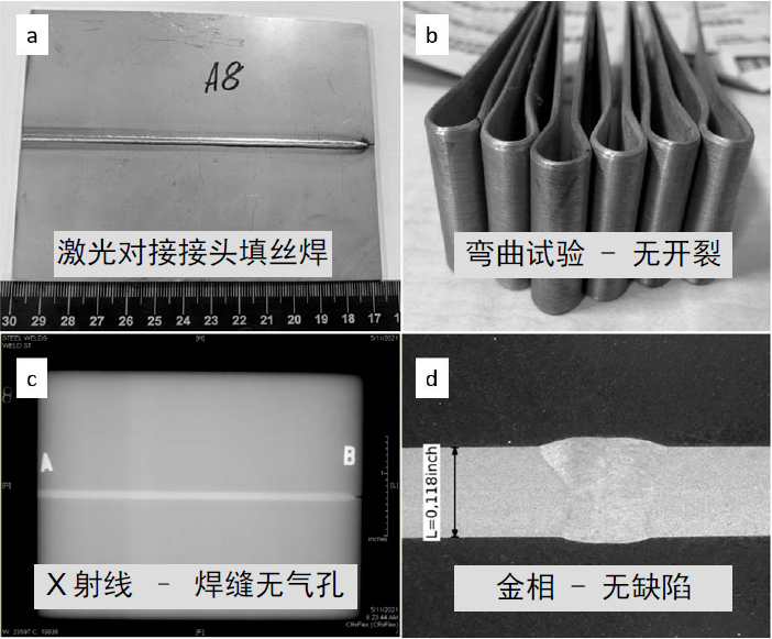圖3. 2.0 mm不銹鋼航空級(jí)質(zhì)量焊縫結(jié)果:a)手持式激光填絲焊樣品;b)彎曲試驗(yàn)結(jié)果:在180°彎曲角度下無開裂;c)焊縫的X射線結(jié)果顯示:焊縫無氣孔;d)焊縫金相結(jié)果顯示:完全熔透,無缺陷和夾雜物。