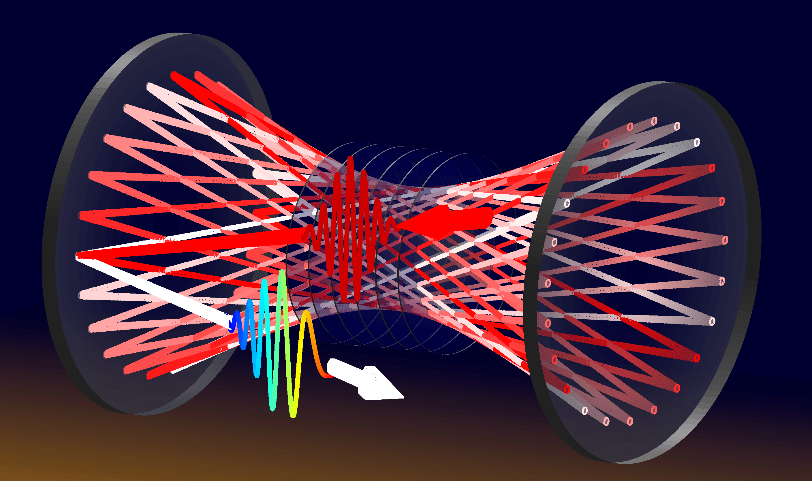 然而,在激光脈沖本身有非常高能量的前提下,因光纖和激光燈絲的方法由于自身器件損壞,不能保持應(yīng)有的波導(dǎo)性質(zhì)而不再適用。在德國電子加速器和耶拿-亥姆霍茲中心的研究者發(fā)現(xiàn)了在高能激光條件下適用的光譜展寬方法。這種方法要求使用兩面鏡子對激光進(jìn)行重新聚焦形成多次反射,并在腔內(nèi)放置多片非線性玻璃。