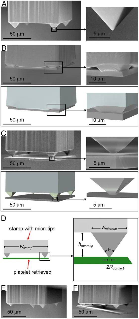 微尖端設(shè)計中具有代表性的彈性印章的SEM和FEM圖像,其表面有或沒有硅片(3μm厚;100×100μm)。(A–C)Four-tipped布局。右框提供了其中一個微針尖的放大視圖,下框提供了有限元建模結(jié)果的相應(yīng)圖像(B,C)。(D)圖章尺寸標(biāo)注示意圖。(E,F(xiàn))Five-tipped布局。在這種設(shè)計中,硅板在轉(zhuǎn)印過程的最后階段僅與最大的中央微尖端保持接觸。