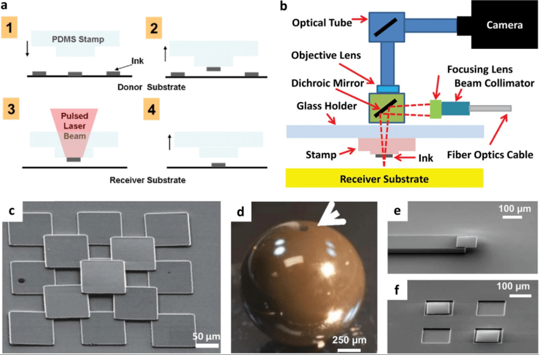 圖17 a) LMTP步驟示意圖。b) LMTP系統(tǒng)的示意圖。c) LMTP構(gòu)造的微結(jié)構(gòu)示例;3D金字塔結(jié)構(gòu),由硅管構(gòu)成。d)在曲面(單個1毫米陶瓷球體)上打印微觀結(jié)構(gòu)的示例。局部和凹入表面的打印微觀結(jié)構(gòu)示例:e)打印在凸臺上,f)打印在凹入空間中。