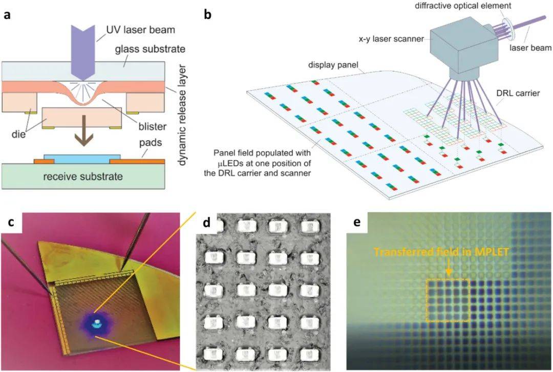 開發(fā)了一種新型的激光輔助模具轉(zhuǎn)移技術(shù),稱為熱機(jī)械選擇性激光輔助模具轉(zhuǎn)移工藝(tmSLADT)。該技術(shù)首先將轉(zhuǎn)移的組件粘合到透明載體上,該載體表面沉積有動態(tài)釋放層(DRL)。在激光照射期間,只有一小部分DRL通過透明載體被紫外線激光燒蝕以產(chǎn)生氣體。與直接使用燒蝕材料的沖擊能量不同,生成的氣體產(chǎn)物可用于形成膨脹的泡罩,該泡罩用作軟噴射針,以將轉(zhuǎn)移組件更輕柔地推向接收基板,如圖16a所示。所創(chuàng)建的泡罩可以以高精度(1.8μm的放置誤差)實現(xiàn)組件的瞬時釋放(轉(zhuǎn)移過程需要<50μs)。通過高速掃描激光束,這一過程可以實現(xiàn)非常高的組裝速度,最高可達(dá)每小時數(shù)十萬個單元。