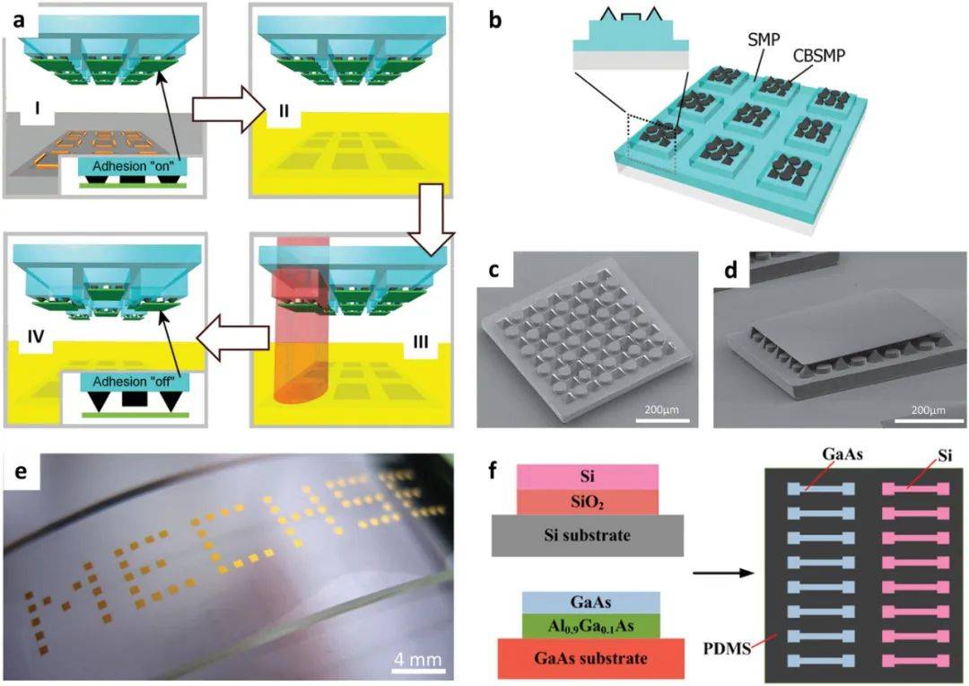 圖18 a)激光驅(qū)動的CBSMP打印過程的操作。b) CBSMP復(fù)合印章示意圖。c) CBSMP印章的掃描電鏡圖像。d) 3μm厚的硅油墨附著在印章上的SEM圖像。e)使用5×5陣列的CBSMP圖章,使用多個并行打印步驟將鍍金硅油墨打印到PDMS基板上的“MECHSE”圖案中。f)硅和砷化鎵的界面和生長襯底的比較,以及預(yù)期的混合打印布局。