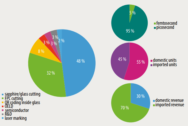 在半導體、顯示器制造和玻璃加工需求的推動下,中國的超快激光市場正在快速增長。2021,超過45家制造商在中國共售出2400臺激光器。銷售的超快激光器中95%是皮秒激光器。飛秒激光只占據(jù)了很小的市場份額。國產(chǎn)激光器占總銷量的55%,但僅占總收入的30%,這表明國產(chǎn)超快激光器的功率水平較低,大多在10至50瓦之間,而進口激光器則用于更高功率的應用。