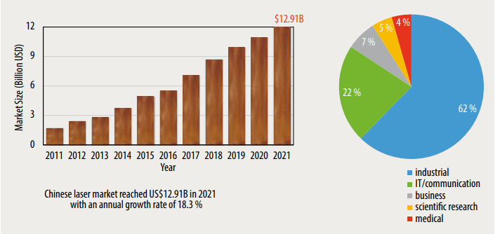 中國激光市場是世界上最大的工業(yè)激光市場。回顧2020年,中國激光產(chǎn)業(yè)全年實現(xiàn)了10個百分點的正增長,遠遠超出預期,2021中國激光產(chǎn)業(yè)繼續(xù)保持增長趨勢。2021,該國激光設(shè)備市場的總體規(guī)模同比增長18.3%,達到創(chuàng)紀錄的129億美元(圖3)。在中國從舊的低技術(shù)產(chǎn)業(yè)向新的高技術(shù)產(chǎn)業(yè)轉(zhuǎn)型的過程中,激光技術(shù)的應用已成為許多制造業(yè)提高產(chǎn)品質(zhì)量、降低成本、最終提高競爭力的關(guān)鍵。