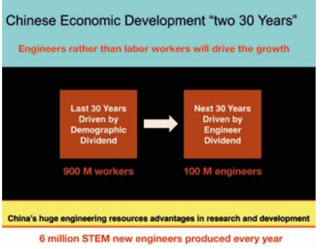 圖2中國經(jīng)濟發(fā)展的兩個30年周期。第一個時期(1981 - 2011年)是由9億低成本勞動力的人口紅利驅(qū)動的。下一個時期(2011 - 2041)是由1億技術(shù)人員和工程師的工程師紅利驅(qū)動的,中國繼續(xù)每年產(chǎn)生600萬工程師。
