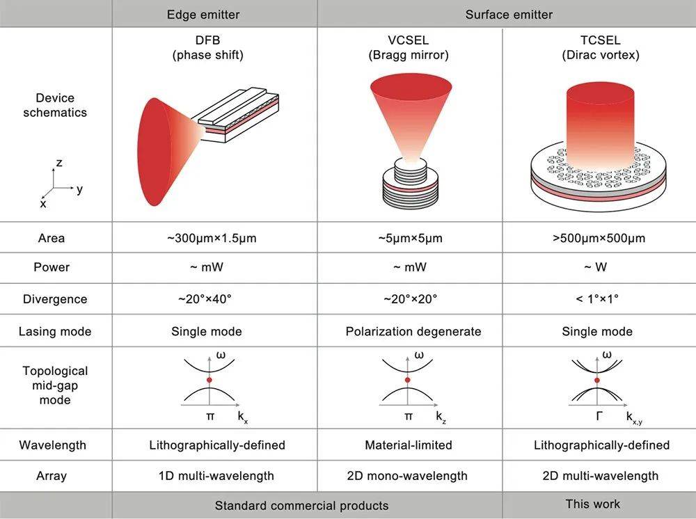 研究人員將TCSEL與單模半導體激光器的標準工業(yè)產(chǎn)品進行了比較。用于互聯(lián)網(wǎng)通信的分布式反饋(DFB)邊緣發(fā)射激光器以及支持手機面部識別的垂直腔面發(fā)射激光器(VCSEL)都在其優(yōu)化的1D諧振器設計中采用中間隙模式。TCSEL通過實現(xiàn)拓撲中間間隙模式的2D版本繼續(xù)這一成功之路,該模式更適合半導體芯片上的平面工藝。