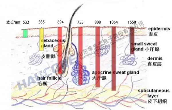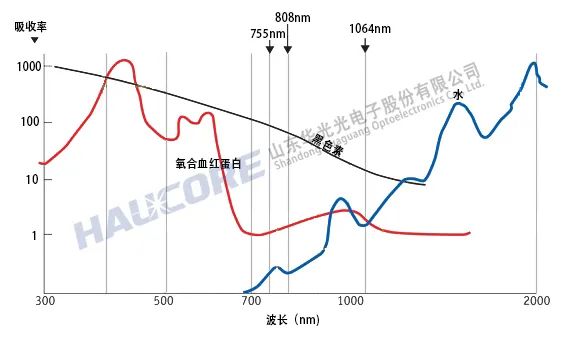 不同的靶組織有其特定的吸收光波,而不同波長的光波又決定其在組織中的穿透深度。640nm-1200nm的光才能穿透到毛囊及以下深度,黑色素對各段光波均有良好的吸收,而血紅蛋白對紅光及波長更長的光波吸收率很低,水對短紅外以下的光波吸收極少,因此僅有可見光和短紅外波長的激光可以對人體進(jìn)行脫毛。