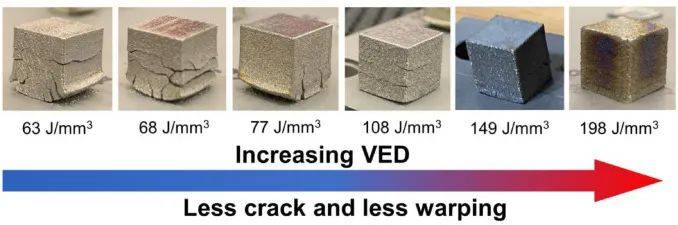 圖5打印立方體Ni51.2Ti48.8零件顯示隨著體積能密度(VED)的增加,裂紋、翹曲和分層等宏觀缺陷的等級降低。