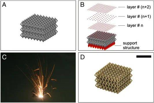 只有少數(shù)AM技術(shù)適用于生產(chǎn)承重金屬植入物。其中一項技術(shù)是選擇性激光熔化工藝(SLM)。上圖示出了SLM過程的幾個步驟。該加工技術(shù)的起點是零件的三維CAD模型(圖A),該零件被切成具有規(guī)定厚度的水平層(圖 B)。每個圖層都包含有關(guān)零件幾何圖形的特定信息。為了將零件固定在基板材料上并增強SLM加工過程中的熱傳導(dǎo),開發(fā)了支撐結(jié)構(gòu)并將其添加到切片CAD模型中(圖 B)。這些細(xì)絲支撐結(jié)構(gòu)由與所需零件相同的材料和相同的SLM工藝制成,但隨后會以機械方式移除。