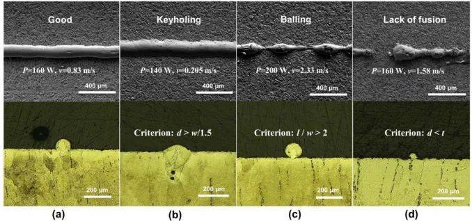 圖1 單軌俯視SEM圖像和橫截面光學(xué)顯微鏡(OM)圖像顯示了具有(a)良好打印質(zhì)量、(b)鎖孔缺陷、(c)成球缺陷和(d)未熔合缺陷的單軌示例。