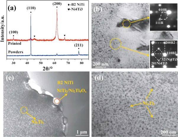 (a)制備粉末和印刷態(tài)NiTi樣品沿建筑方向的XRD圖譜;以及具有打印態(tài)NiTi SAED圖案的亮場TEM顯微照片:(b)B2基體,嵌入R和Ni4Ti3相(帶圓圈)。插圖顯示了R和Ni4Ti3相的SAED模式;(c)晶界有Ni4Ti3析出物和少量NiTi2相(帶圓圈);(d) Ni4Ti3沉淀均勻嵌入晶粒內(nèi)部。