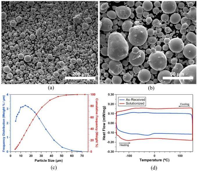 圖3 (a)(b)收到的Ni51.2Ti48.8粉末的低倍和高倍SEM圖像。(c)粉末的粒度分布(PSD)和(d)粉末和粉末在950℃固溶熱處理24h后的差示掃描量熱(DSC)結(jié)果。