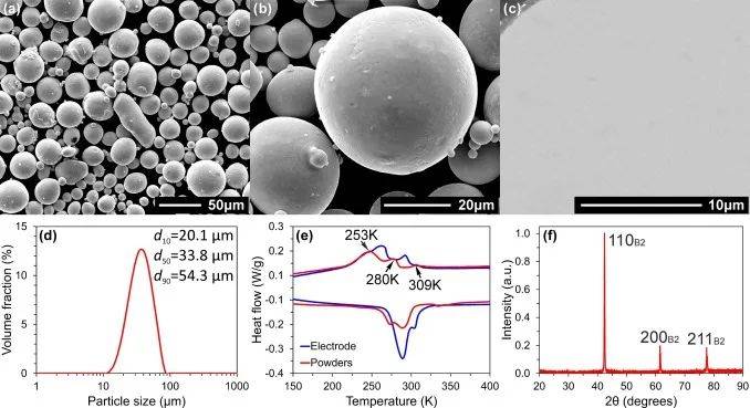 (a)和(b)顯示NiTi粉末形態(tài)的二次電子圖像。(c)顯示NiTi粉末橫截面微觀結(jié)構(gòu)的背散射電子(BSE)圖像。(d) NiTi粉末的粒度分布。(e)如DSC所示,NiTi粉末和用于生產(chǎn)NiTi粉末的NiTi電極的轉(zhuǎn)變行為。(f)室溫下收集的NiTi粉末的X射線衍射圖。