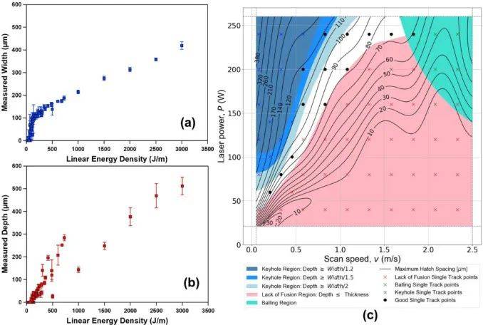 圖4 (a)(b)在打印的單軌中,熔體池測量的寬度和深度隨線性能量密度(P/v)的變化。(c)收到的Ni51.2Ti48.8(at.%)粉末。