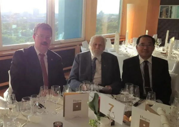 圖|2013年在柏林受博士導(dǎo)師哈肯教授(中)邀請參加德國年度科學(xué)和藝術(shù)界大十字勛章(Orden Pour le mérite)獲得者會(huì)議晚宴