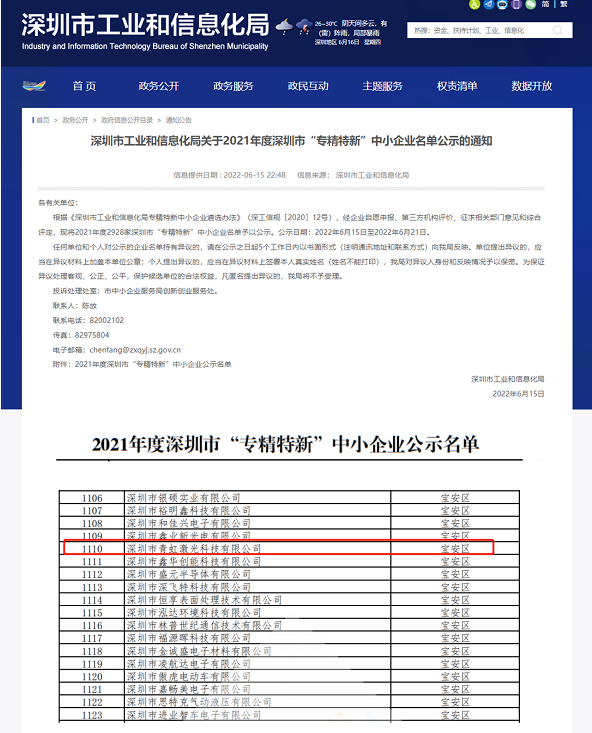 近日,深圳市工業(yè)和信息化局開展了2021年度深圳市“專精特新”中小企業(yè)認(rèn)定工作,青虹激光憑借著在高端精密加工領(lǐng)域的精細(xì)化,專業(yè)化,在此次評選中成功入選?!皩>?..
