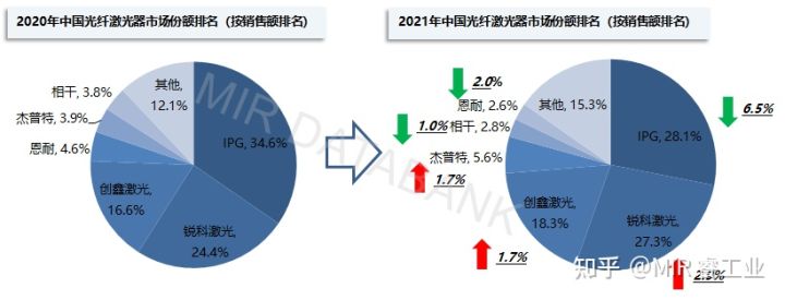 從2008年IPG披露中國區(qū)營收以來,十?dāng)?shù)年IPG在中國的光纖激光市場份額始終處于壟斷地位,直到2021年,銳科激光以營收34.1億元的成績,實現(xiàn)了僅與IPG相差0.8%的市場份額,幾近追平。以其增速來看,預(yù)計2022年,銳科激光將成為首家在中國光纖激光器市場份額超過IPG的廠商。