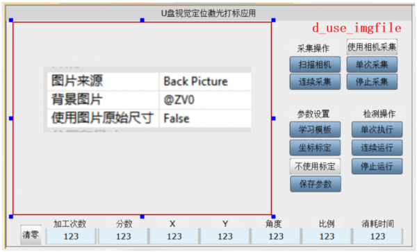 對流水線上的U盤進(jìn)行匹配定位,識別它們的位置坐標(biāo)發(fā)送給執(zhí)行機(jī)構(gòu)進(jìn)行激光打標(biāo)。并在主界面上顯示它們的位置信息,以及統(tǒng)計(jì)當(dāng)天的物料上料情況。