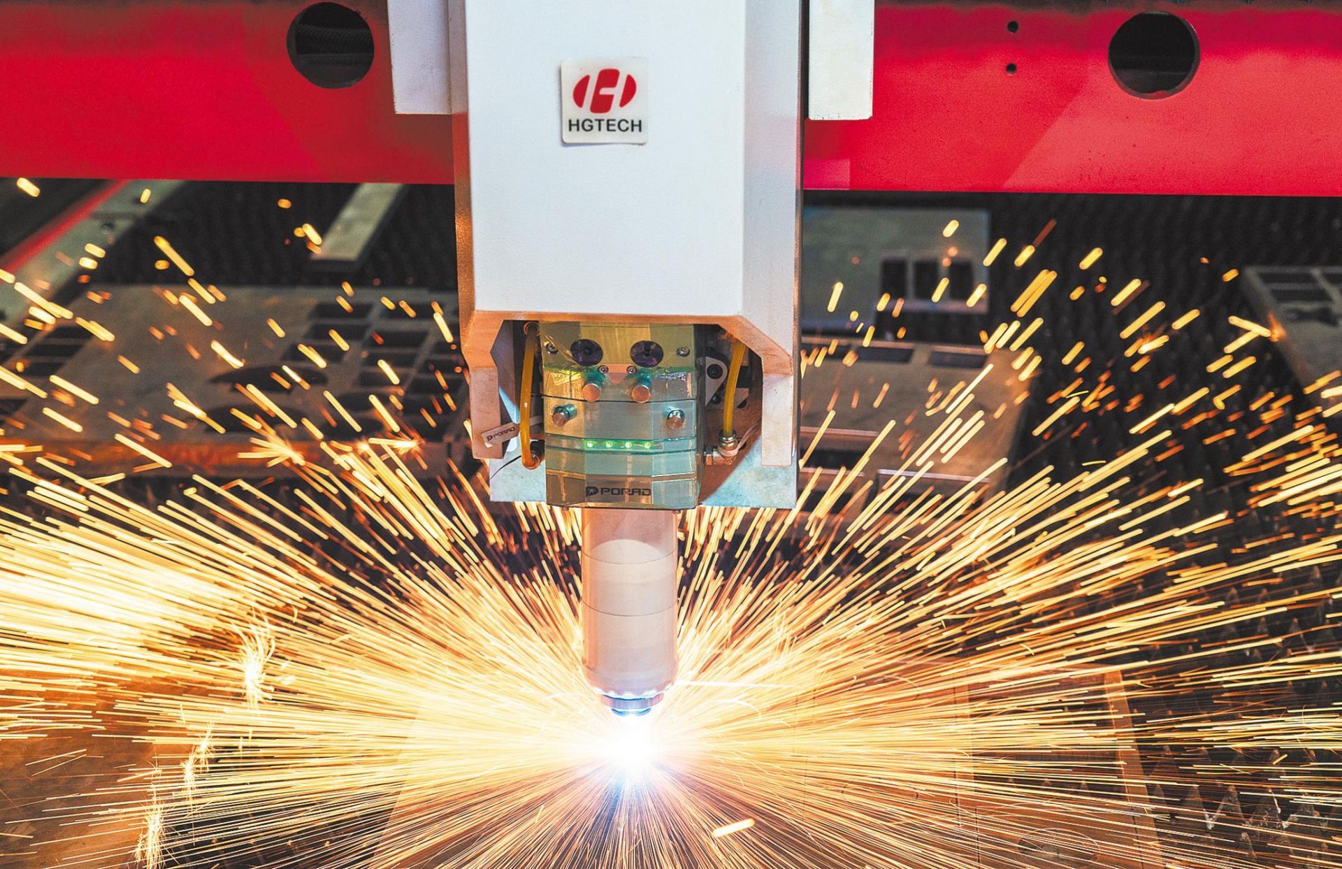 華工激光產(chǎn)業(yè)園內(nèi),正在測試、校準(zhǔn)的智能激光切割機(jī)切割鋼板。