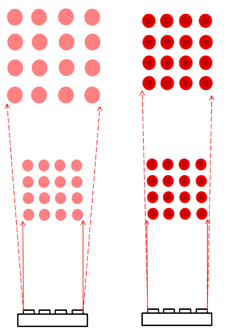 圖 1. 激光雷達(dá)光源探測(cè)示意圖,左為常規(guī),右為更高功率密度、更小發(fā)散角優(yōu)化結(jié)果。