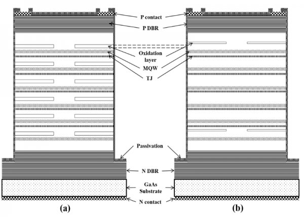 圖 3.發(fā)散角優(yōu)化機(jī)理。(a)傳統(tǒng)6結(jié)VCSEL的結(jié)構(gòu)圖,(b)針對(duì)發(fā)散角性能的優(yōu)化結(jié)構(gòu)。