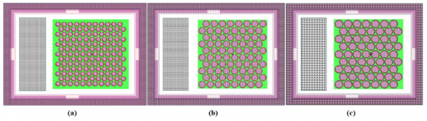 圖 4.填充因子優(yōu)化機(jī)理。a)填充因子為27.0%的版圖設(shè)計(jì),b)填充因子為42.0%的版圖設(shè)計(jì),c)填充因子為48.8%的版圖設(shè)計(jì)。