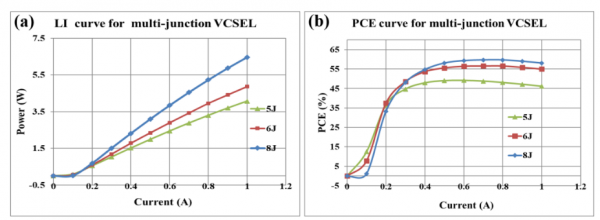 圖6.100Hz 10us脈沖電流驅(qū)動(dòng)下的5/6/8結(jié)VCSEL陣列LI和PCE曲線。a)LI曲線,b)PCE曲線。