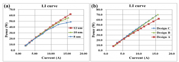 圖8.不同填充因子設(shè)計(jì)的LI性能對(duì)比。a)不同氧化孔徑尺寸下的LI曲線,b)不同填充因子版圖設(shè)計(jì)A、B、C的LI曲線。