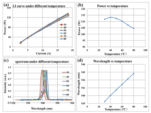 圖10. 8結(jié)VCSEL陣列的變溫性能。a)不同溫度下的LI曲線,b)功率隨溫度變化曲線,c)光譜隨溫度變化曲線,d)波長(zhǎng)漂移與溫度關(guān)系。