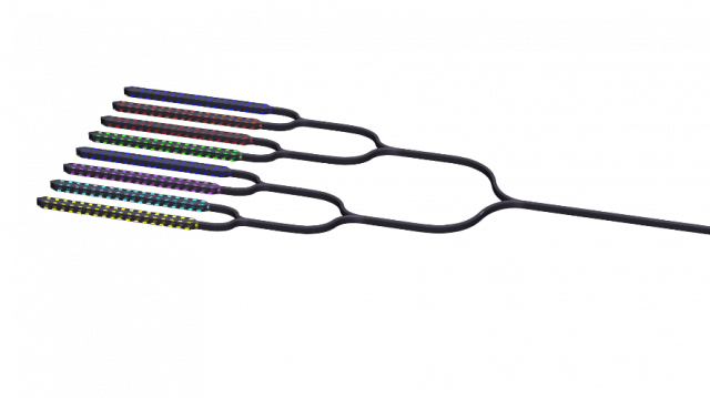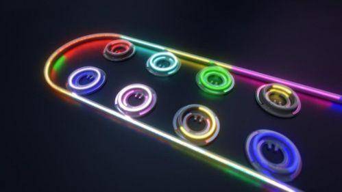 8個(gè)微環(huán)調(diào)制器和光波導(dǎo)。每個(gè)微環(huán)調(diào)制器都被調(diào)節(jié)到特定的波長(zhǎng)(或者說(shuō)“光色”)。利用多波長(zhǎng),每個(gè)微環(huán)都可單獨(dú)調(diào)制光波,以實(shí)現(xiàn)獨(dú)立通信。這種使用多個(gè)波長(zhǎng)的方法就叫做波分復(fù)用。(圖片來(lái)源:英特爾公司)