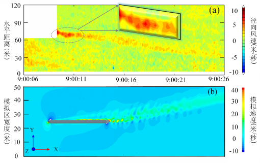 為進一步測試?yán)走_觀測性能和環(huán)境適應(yīng)性,團隊在安徽省宿州市高鐵站實地測量了高速列車尾流中的風(fēng)場結(jié)構(gòu)。雷達在無人值守下連續(xù)穩(wěn)定工作超過100小時,獲得了3米和0.1秒高時空分辨率下的350公里每小時的高鐵尾流連續(xù)觀測,并首次利用激光雷達捕捉到高鐵尾流中類似于馮卡門渦街的風(fēng)場結(jié)構(gòu),與計算流體力學(xué)模擬結(jié)果高度一致。