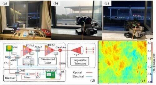米級(jí)分辨率的大氣風(fēng)場探測在航空航天安全、高價(jià)值目標(biāo)保障、數(shù)值天氣預(yù)報(bào)等方面具有重大意義。為了獲取3米和0.1秒時(shí)空分辨率的風(fēng)場,需再提高現(xiàn)有激光雷達(dá)信號(hào)檢測靈敏度2個(gè)數(shù)量級(jí)以上??蒲袌F(tuán)隊(duì)通過在激光光源、光學(xué)收發(fā)系統(tǒng)、高速數(shù)據(jù)采集電路和數(shù)據(jù)處理算法上對(duì)激光雷達(dá)進(jìn)行全面優(yōu)化,提出一種新的反演算法,大大提高了風(fēng)場反演精度和穩(wěn)健性,最終實(shí)現(xiàn)了一套全國產(chǎn)化的“產(chǎn)品級(jí)”測試樣機(jī),具有人眼安全、設(shè)備輕便(整裝設(shè)備40公斤)、工作穩(wěn)定、環(huán)境適應(yīng)性強(qiáng)等特點(diǎn)。