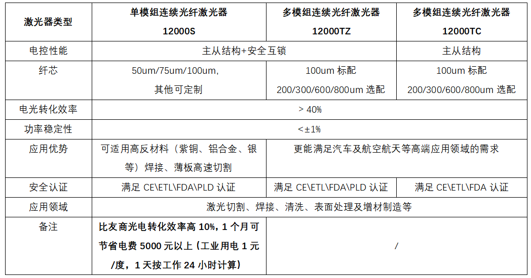 此外,為了滿足不同公司個(gè)性化應(yīng)用需求,同種功率下銳科激光可提供更多選擇。以12 kW為例,銳科激光生產(chǎn)制造單模組連續(xù)光纖激光器12000S、多模組連續(xù)光纖激光器12000TZ、12000TC等多種同功率的光纖激光器,而且同一類(lèi)型的激光器還可定制匹配不同的纖芯,可最大程度地滿足客戶的需求。