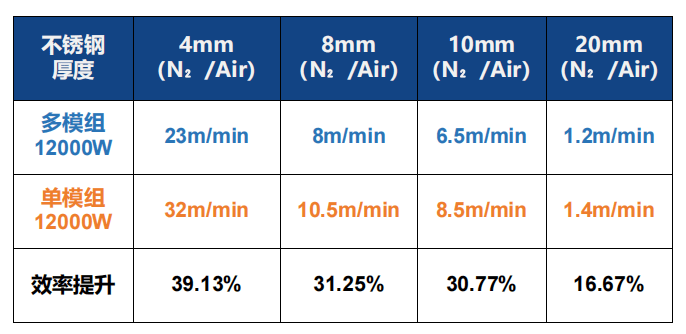 單模組萬(wàn)瓦激光器的優(yōu)勢(shì)在中薄板切割速度,以銳科單模組12000和多模組12000激光器進(jìn)行對(duì)比,在20 mm以下不同厚度的不銹鋼輔助氮?dú)饣蚩諝馇懈顥l件下,單模組12000切割效率優(yōu)于多模組12000光纖激光器。