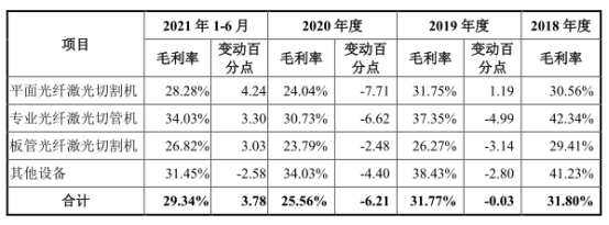 其中,平面光纖激光切割機毛利率分別為30.56%、31.75%、24.04%、28.28%;專業(yè)光纖激光切管機毛利率分別為42.34%、37.35%、30.73%、34.03%;板管光纖激光切割機毛利率分別為29.41%、26.27%、23.79%、26.82%;其他設備毛利率分別為41.23%、38.43%、34.03%、31.45%。